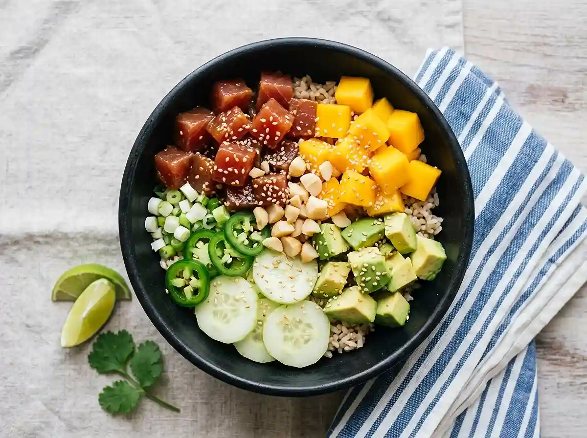 A fresh Ahi Poke Mango Bowl with marinated sushi-grade ahi tuna, sweet mango, creamy avocado, and crisp cucumber over brown rice, topped with macadamia nuts and sesame seeds.