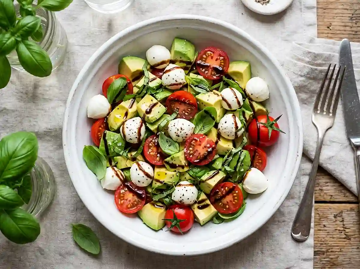 A fresh Italian-inspired salad combining creamy avocado, juicy cherry tomatoes, mini mozzarella balls, and basil with olive oil and balsamic glaze.