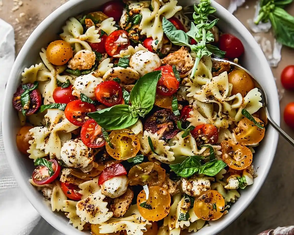 Watery or overly wet salad: Use slightly drier tomatoes or scoop out some of the excess juice before mixing. Let the pasta cool completely before combining—warm pasta releases more moisture and can make the whole dish soupy.