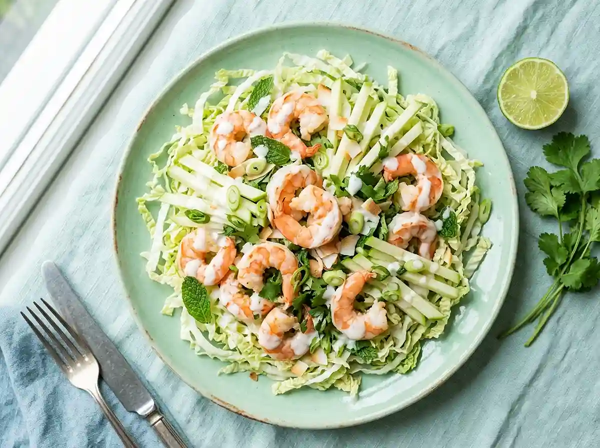 A refreshing tropical salad with tender shrimp, crisp napa cabbage, green apple, and fresh herbs tossed in a creamy coconut lime dressing.
