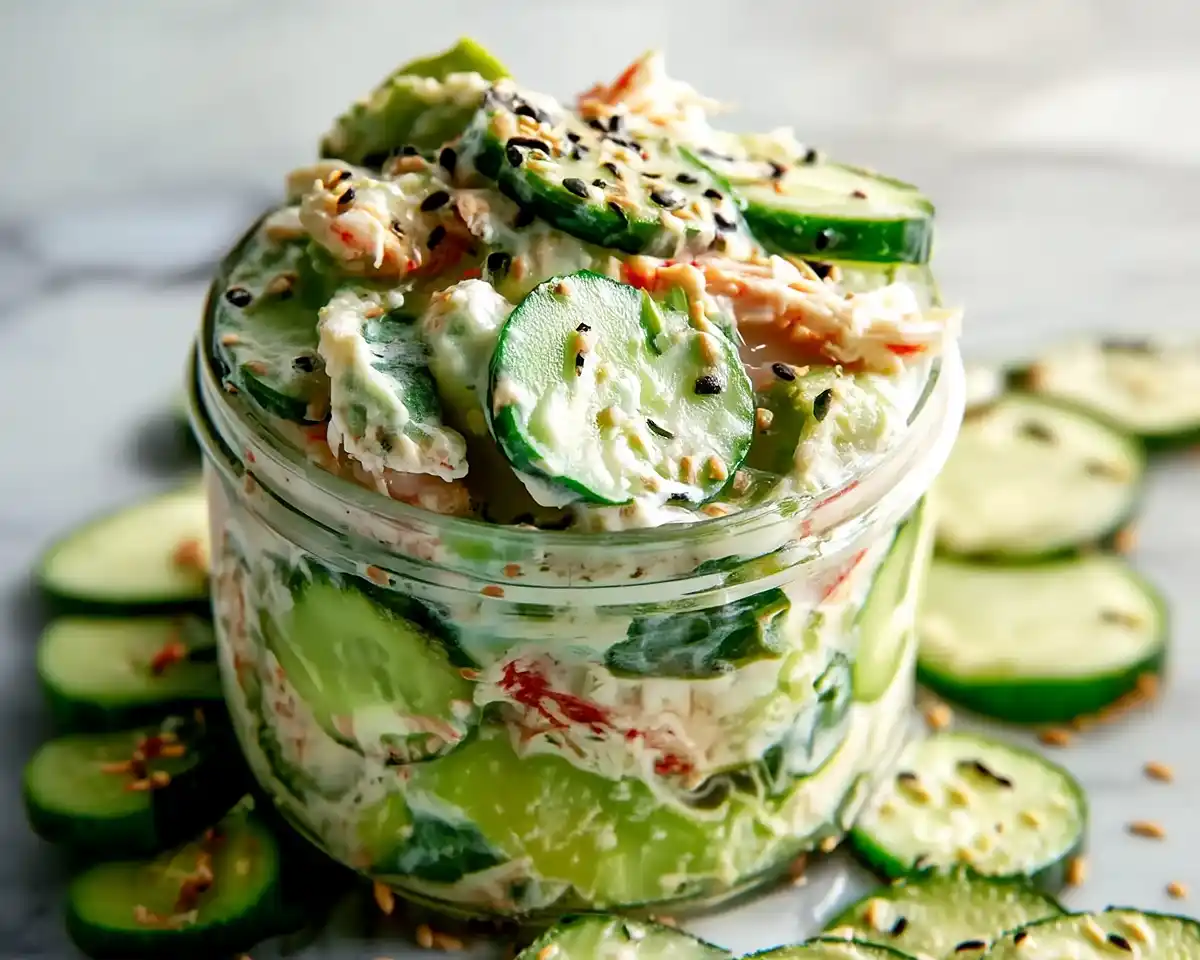 For meal prep, slice your cucumbers and chop your crab up to two days ahead and store them separately. Mix the cream cheese, mayo, soy sauce, and sesame seeds in a small jar and refrigerate. When you’re ready to eat, combine everything in a container, shake, and enjoy within minutes—it’s perfect for packed lunches or quick dinners.