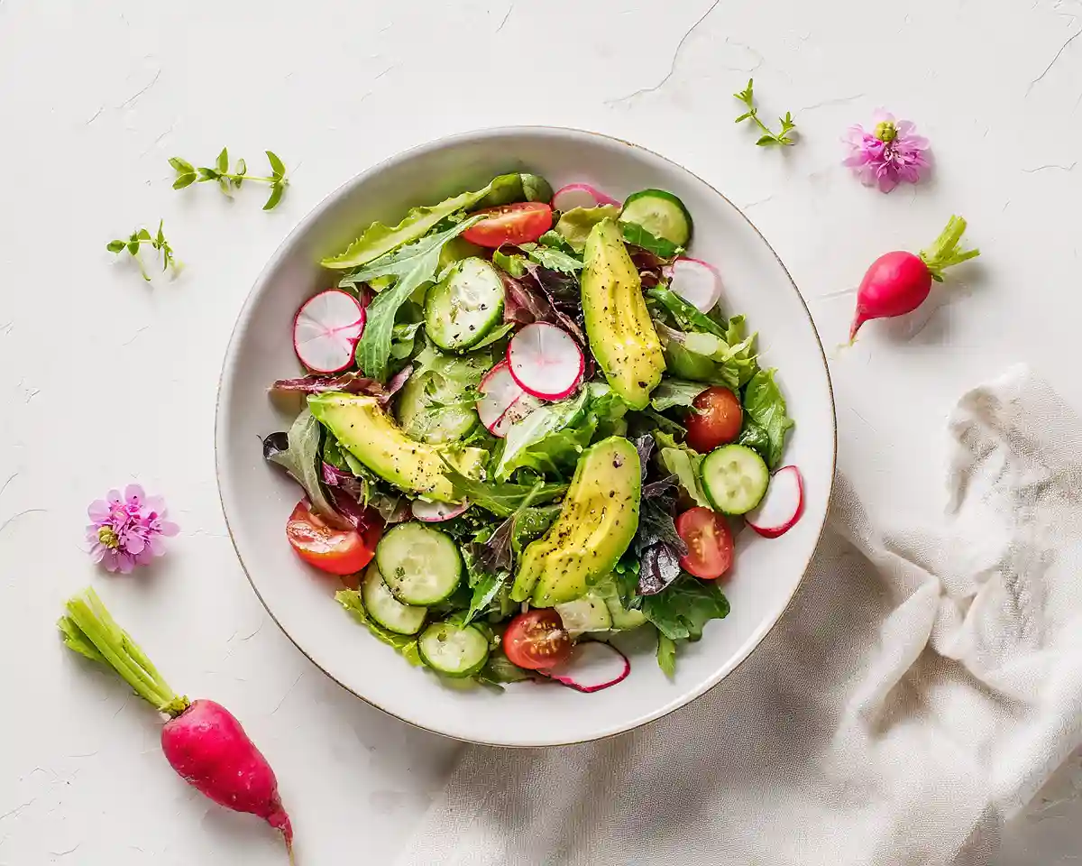 Step 3: Gently fold in the cherry tomatoes, cucumbers, radishes, and avocado, distributing them evenly throughout the greens. Handle the avocado pieces with care so they maintain their shape and don’t turn mushy. The radishes should look like little pink jewels scattered throughout your Golden Spring Salad, adding both crunch and visual appeal.