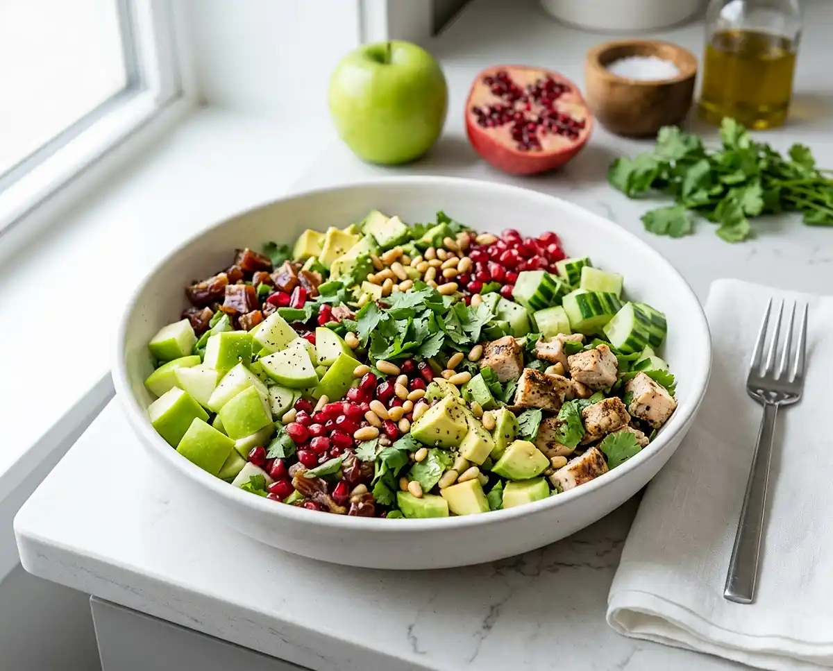 • Combine and Dress the Salad. Add the diced cucumber, apples, pomegranate seeds, chopped dates, and diced avocado to the bowl. In a small cup, whisk together the olive oil and lemon juice until they emulsify into a light, slightly cloudy stream, then pour this dressing over the fruit and toss gently — the lemon immediately brightens every surface and prevents the apple and avocado from browning. Season generously with kosher salt and freshly cracked pepper, then fold in the roughly chopped cilantro and scatter the toasted pine nuts across the top. If adding chicken, nestle the chunks into the salad now.