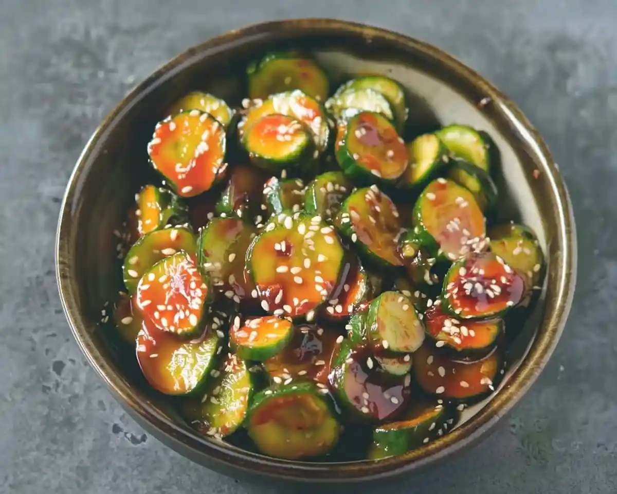 - Step 4: Combine and Chill – Drain away any remaining liquid from your cucumbers, then transfer them to a large bowl and pour the prepared dressing over top. Mix everything together until each cucumber slice is beautifully coated in that spicy, fragrant dressing, then top with additional sesame seeds.