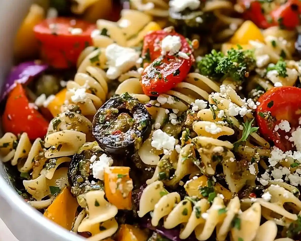 There’s something almost magical about a big, gorgeous bowl of Marinated Vegetarian Pasta Salad sitting on your counter — all those jewel-toned roasted veggies, curly pasta catching every drop of lemony dressing, and fat chunks of creamy feta just waiting to be tossed together.