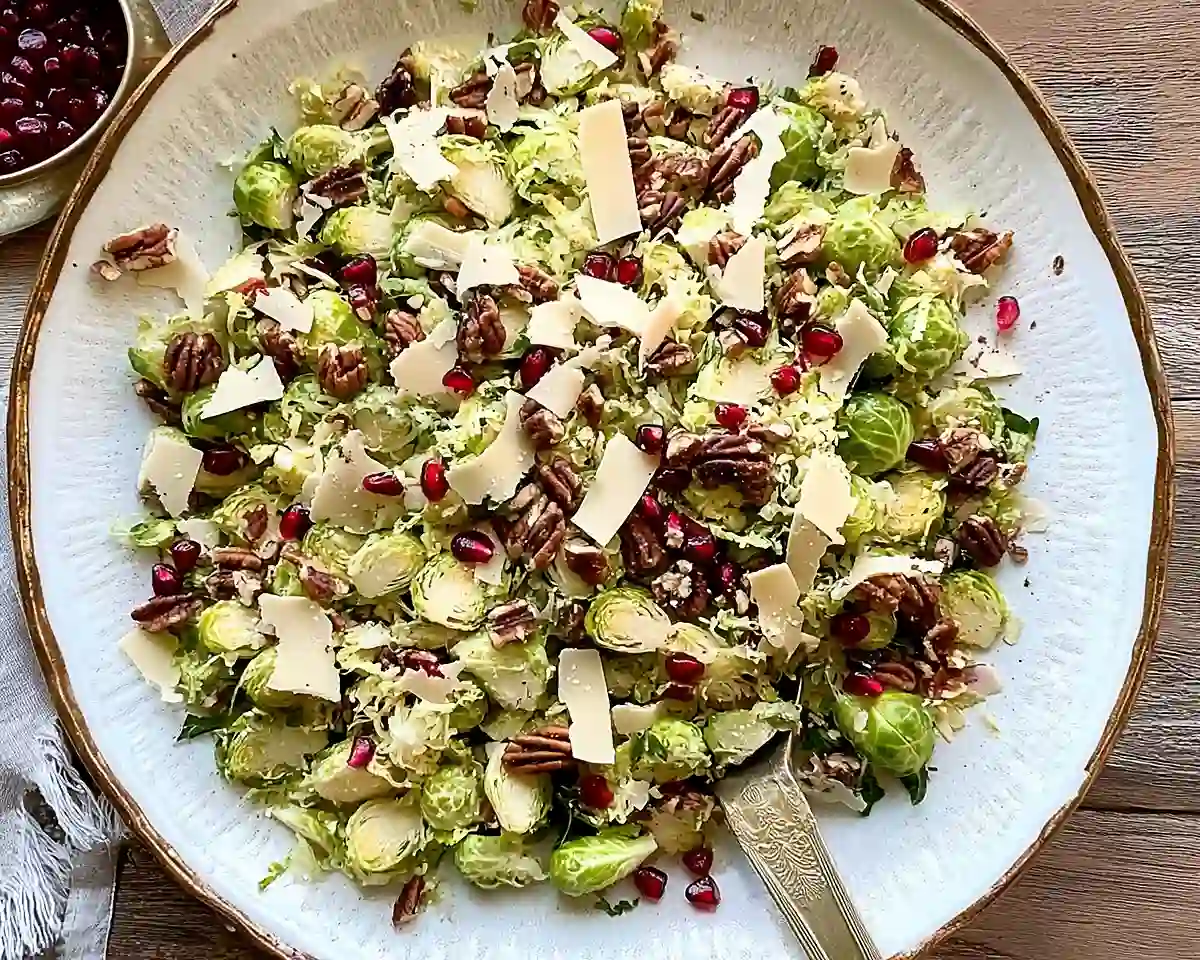 • Let the salad sit for about 30 minutes before serving to allow the acid in the dressing to gently soften the raw sprouts while maintaining their delightful crunch. When ready to serve, top with extra parmesan shavings, a handful of pomegranate arils, and more of those irresistible candied pecans.