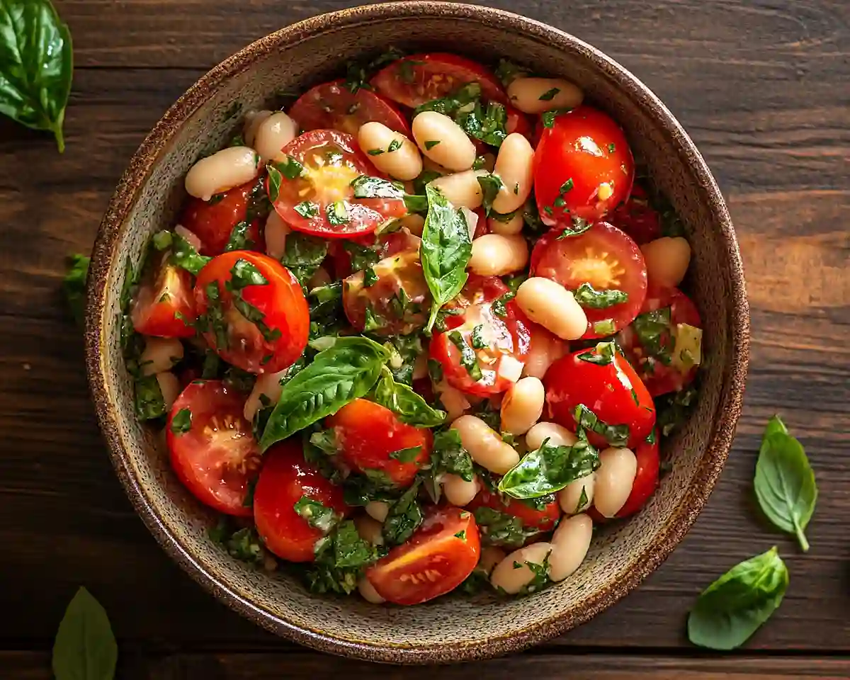 A vibrant, protein-packed tomato and bean salad bursting with fresh basil and parsley, ready in under 10 minutes. Perfect for busy families, meal prep, and summer gatherings.