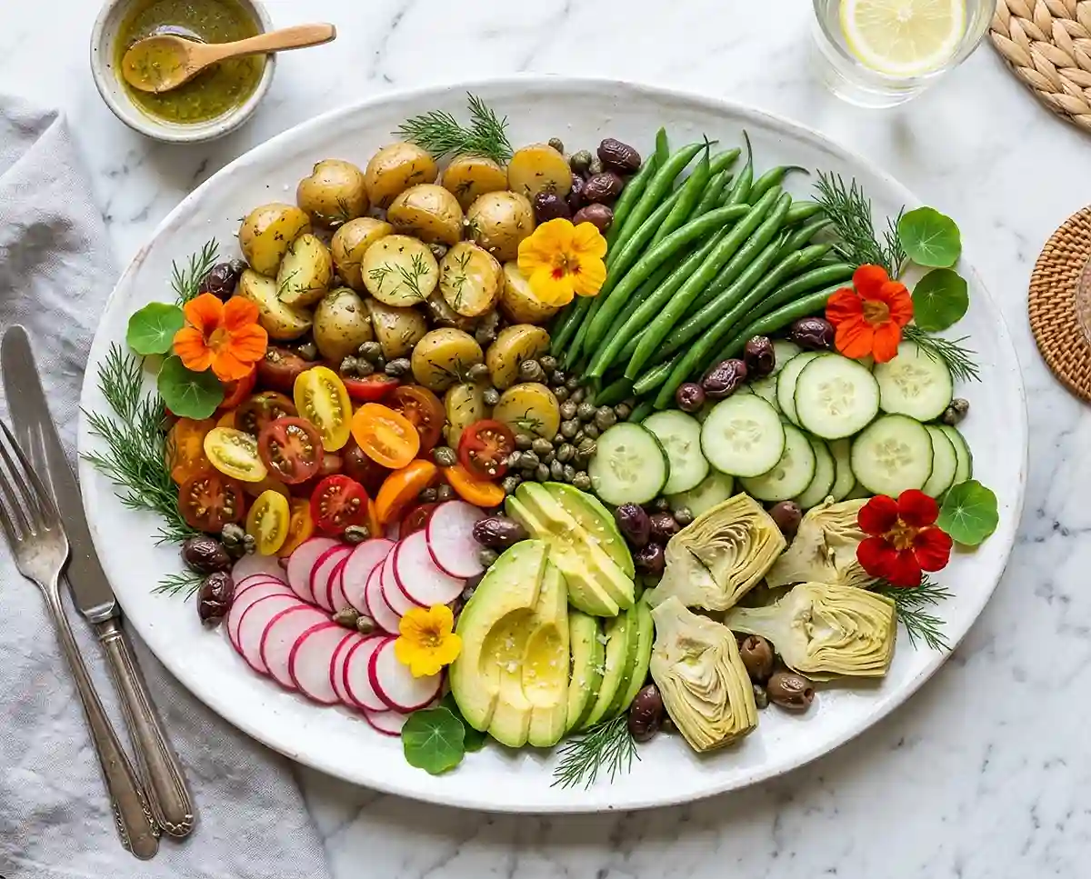 - Choose your most beautiful large platter for assembly—this nicoise salad is meant to be a showstopper. Arrange each vegetable in its own distinct section: green beans in one area, halved potatoes in another, tomatoes, cucumbers, radishes, avocado, and artichoke hearts each claiming their own space.