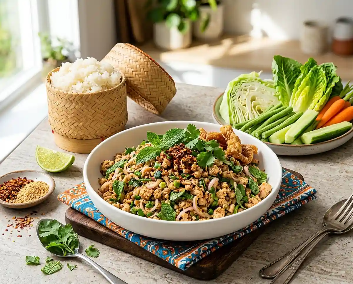 Lettuce wrap party: Skip the sticky rice entirely and set out a platter of butter lettuce cups, iceberg wedges, and endive leaves — let everyone spoon warm larb into their own wraps for an interactive, low‑carb version of this [spicy thai recipe]. Add sliced cucumbers, shredded carrots, and a squeeze of sriracha on the side for customizing.
