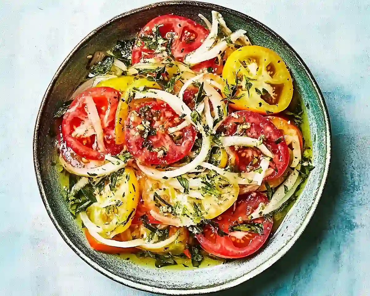 A stunning heirloom tomato salad featuring crisp fennel, briny Castelvetrano olives, and a garlicky-herb vinaigrette. This fresh, minimal-effort recipe comes together in just 10 minutes and celebrates peak summer produce with elegant simplicity.